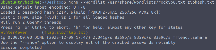 rockyou.txt.john --wordlist=/usr/share/wordlists/rockyou.txt ziphash.txt