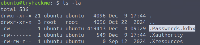 ls -la /home/La extensión .kdbx corresponde a KeePass, un gestor de contraseñas. Es muy probable que la clave que buscamos esté ahí dentro, pero... también está protegida por una contraseña maestra.