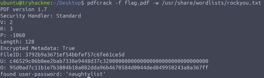 La contraseña es naughtylist. Al abrir el PDF desencriptado, encontramos la primera flag.