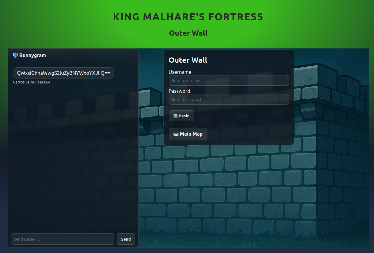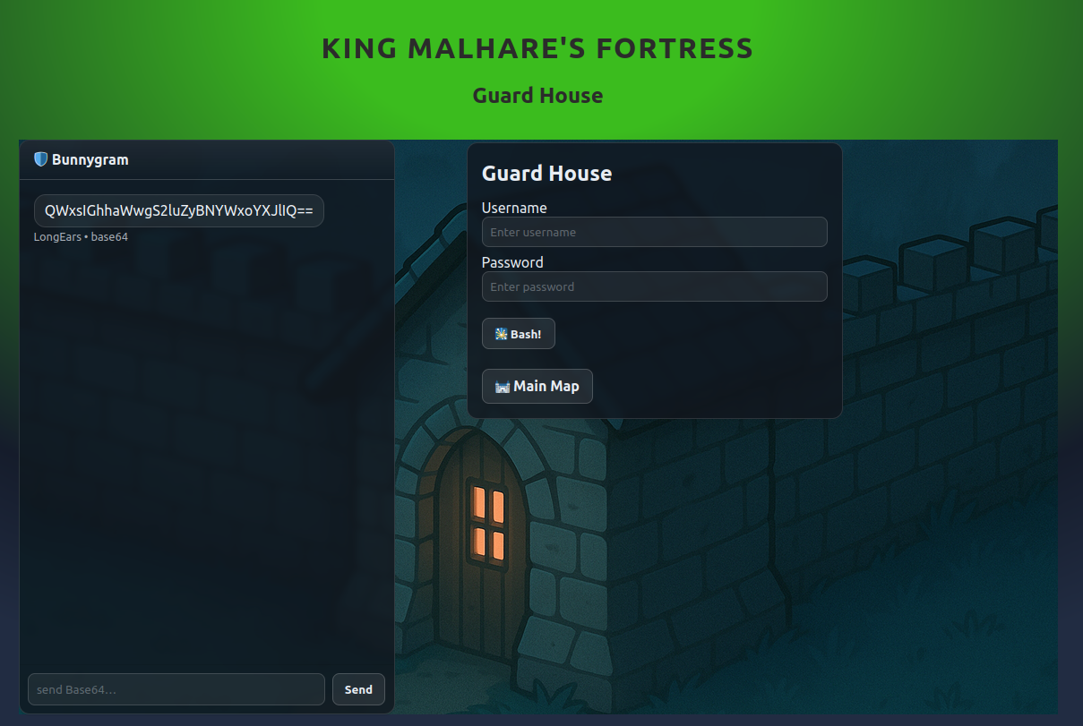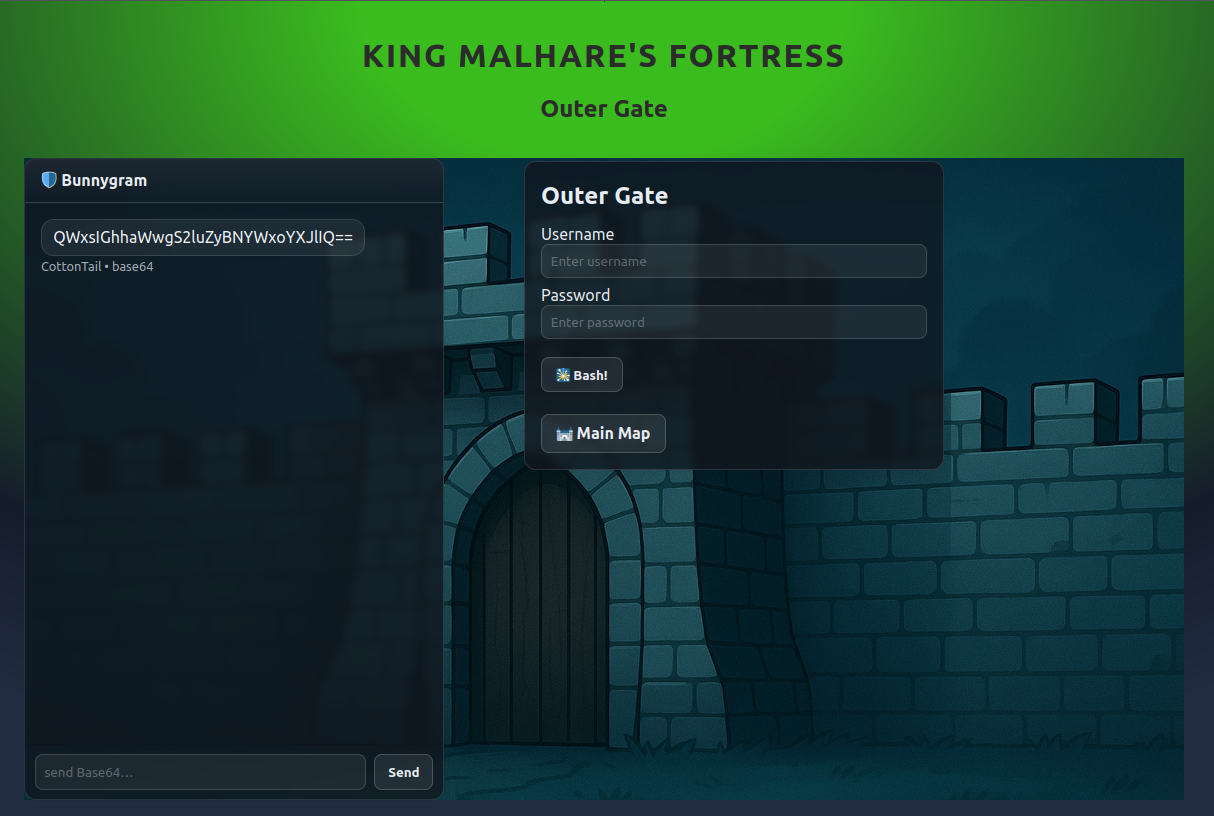 Nuestra primera parada es la puerta exterior. Nos encontramos con un formulario de acceso y un chat con el guardia, pero la comunicación no fluye: el guardia nos habla en lo que parece ser Base64.