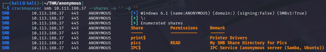 crackmapexec smb 10.113.188.37 --shares -u '' -p ''smb→ Módulo de SMB de crackmapexec--shares→ Enumera los recursos compartidos disponibles-u ''→ Usuario vacío (acceso anónimo/guest)-p ''→ Contraseña vacía