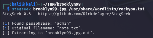 stegseek brooklyn99.jpg /usr/share/wordlists/rockyou.txtAtaque de diccionario contra archivo estenografiado