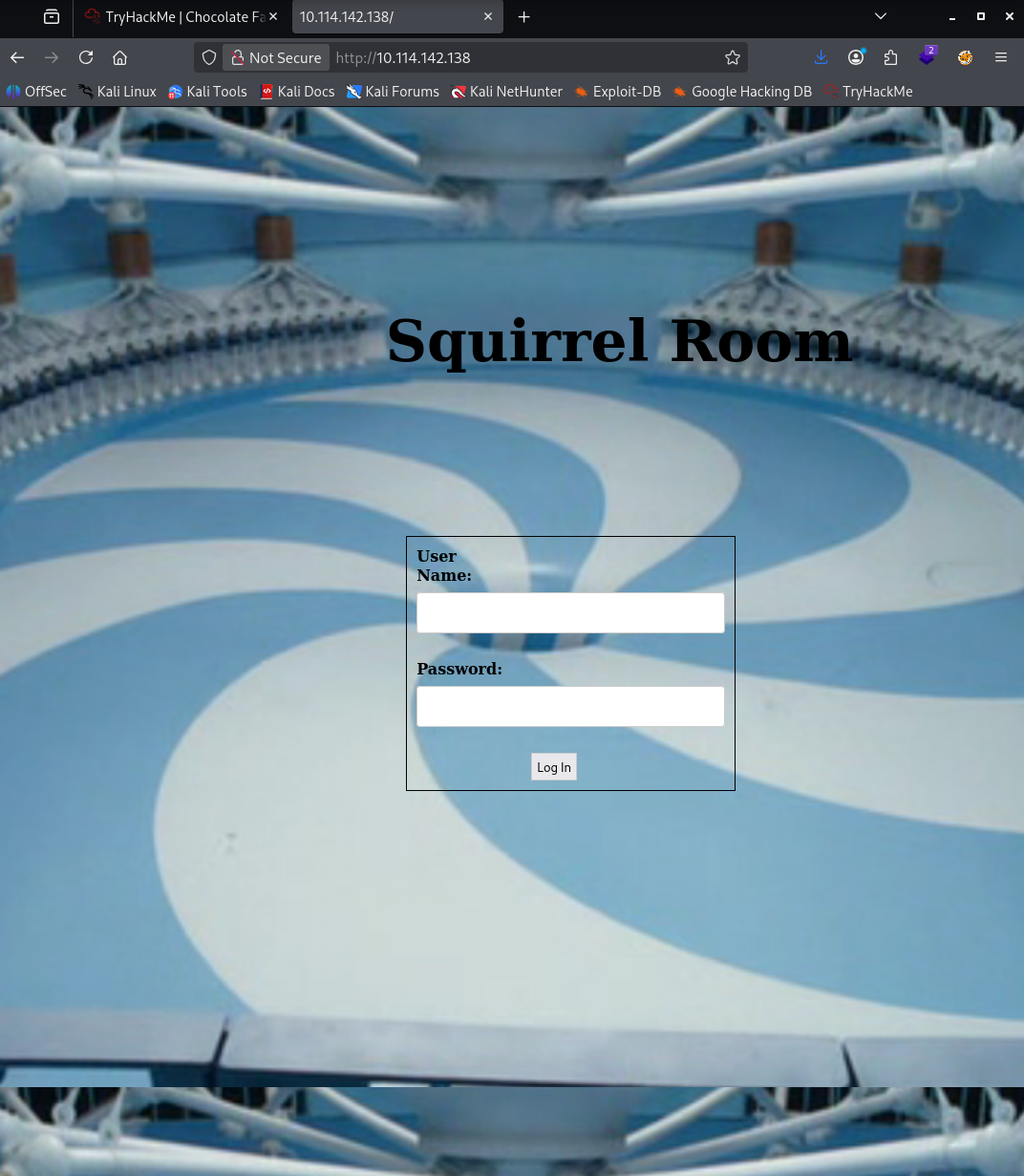 Al acceder a http://10.114.142.138 encuentro un formulario de login con la temática de la fábrica de chocolate.