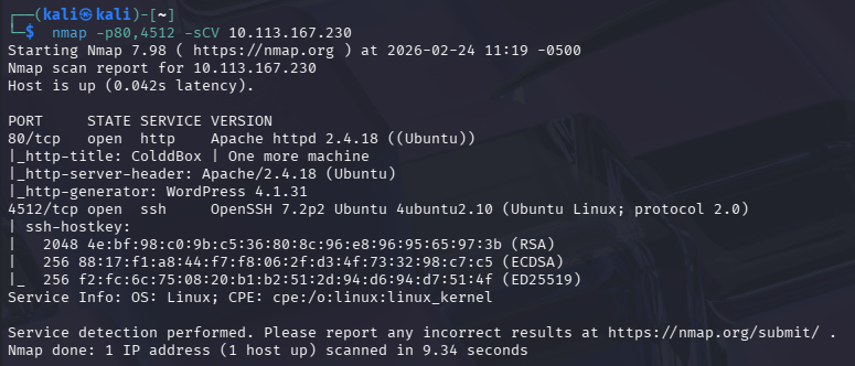 ssh c0ldd@10.113.167.230 -p 4512El SSH está en el puerto 4512, según el escaneo inicial