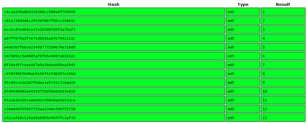 /c51ce410c124a10e0db5e4b97fc2af39Trece rutas, cada una con una cadena de 32 caracteres hexadecimales. Parece que podría ser un hash MD5. Las meto en CrackStation para comprobarlo: