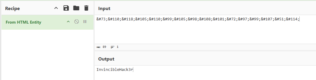 Efectivamente, es HTML Entity encoding. La contraseña es InvincibleHack3r.