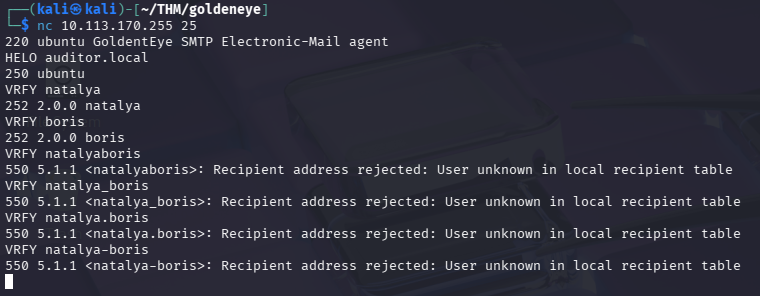 nc 10.113.170.255 25220 ubuntu GoldentEye SMTP Electronic-Mail agent