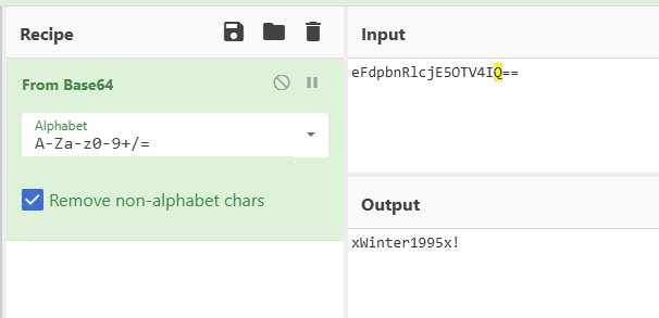 Lo decodifico con CyberChef y obtengo: xWinter1995x!