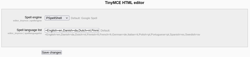 Después voy a Plugins → Text editors → TinyMCE y activo aspell como corrector ortográfico predeterminado.