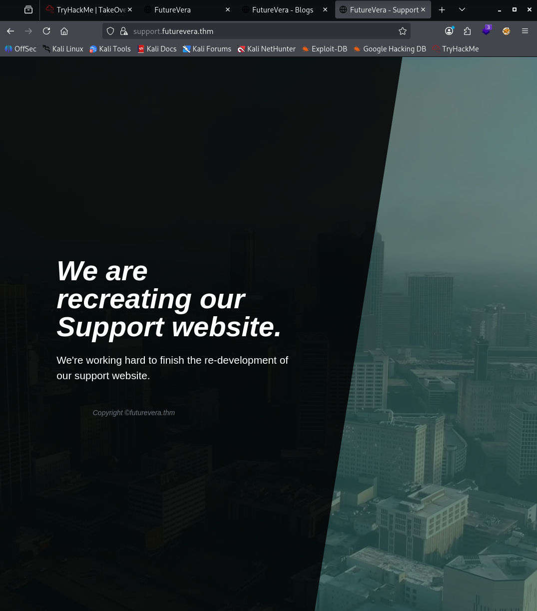 En support.futurevera.thm solo veo un mensaje de mantenimiento, sin funcionalidad adicional: