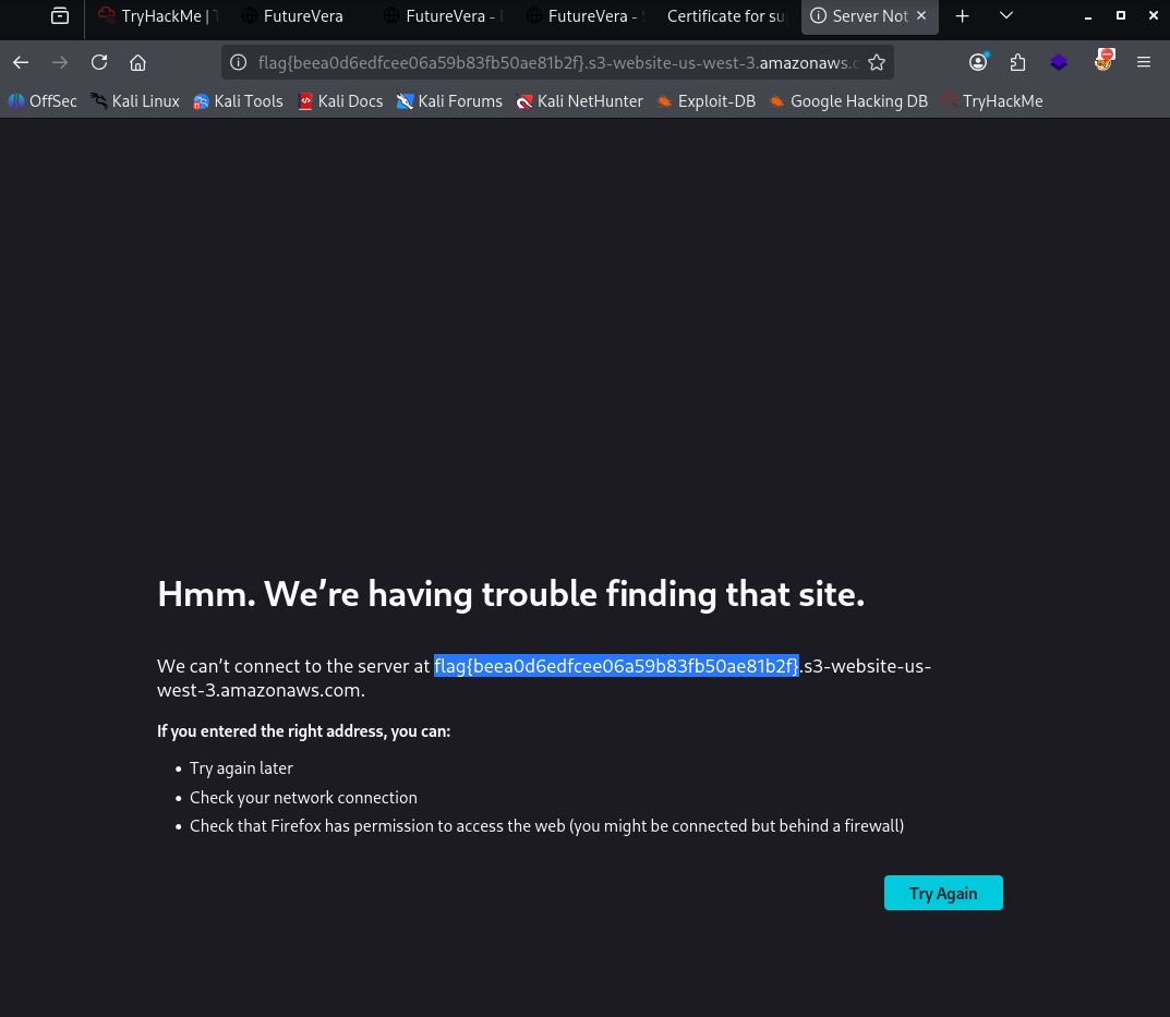 En el host secrethelpdesk934752.support.futurevera.thm, el error de conexión muestra el nombre del backend y ahí aparece la flag en el hostname de un bucket S3.